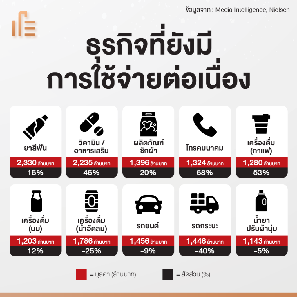 ทางด้านของแบรนด์ที่ยังมีการใช้จ่ายอยู่นั้น ส่วนใหญ่ยังคงเป็นแบรนด์ที่มองว่ายังมีโอกาสในการรักษาชื่อเสียงของแบรนด์อยู่ เราจึงเห็นสินค้าหลายแบรนด์ยังคงทำตลาดและลงโฆษณาต่อเนื่อง เพียงแต่เม็ดเงินอาจจะไม่ได้ทุ่มไปในช่องทางหลักแต่จะกระจายไปหลายๆ สื่อเพียงรักษาโอกาสในช่วงวิกฤตโควิดแบบนี้