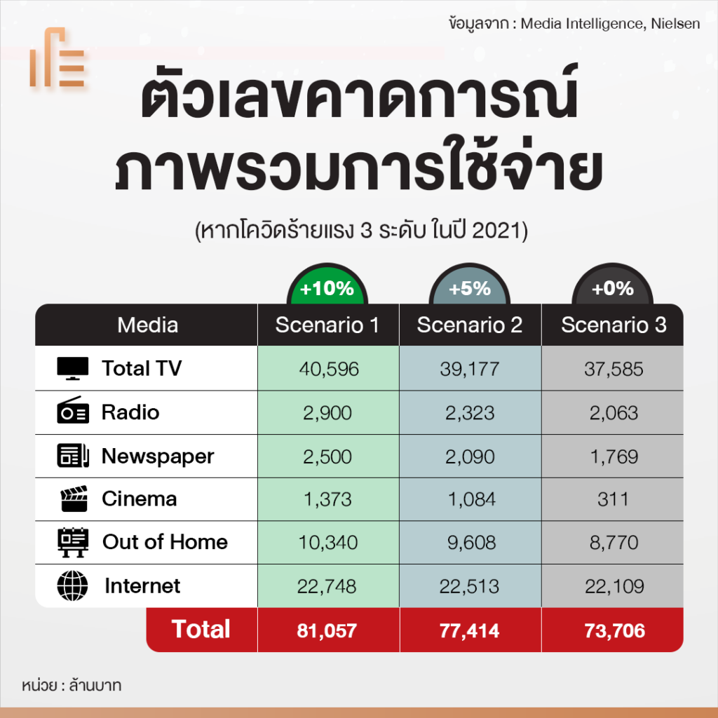 หากมีการล็อกดาวน์ในจังหวัดหลักรอบสองนั้น อาจจะเกิดผลกระทบในวงกว้าง จะมาพร้อมความกังวลและส่งผลต่อวงการหนักมาก ถ้าเกิดเหตุการณ์นี้ โอกาสเติบโตรอบนี้อาจไม่มีหรือติลบ แต่มองว่ายังเท่าปีที่แล้ว ตัวเลขจะอยู่ที่ 73,706 ทีวีและสื่อออนไลน์จะโตมากขึ้นเพราะคนอยู่บ้านและดูทางช่องหลักและเสพออนไลน์หนักขึ้น
