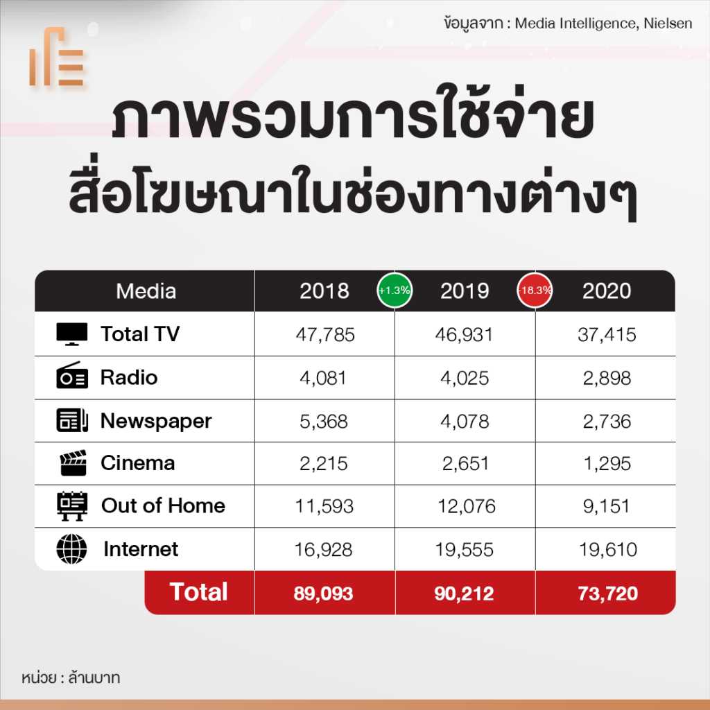 คุณภวัต เรืองเดชวรชัย ประธานกรรมการ กลุ่มบริษัท มีเดีย อินเทลลิเจนซ์ จำกัด กล่าวว่า ด้วยตัวเลขภาพรวมโฆษณาของปี 2020 ที่ติดลบเกือบ 20% แต่สื่อทีวีและอินเทอร์เน็ตยังมีทิศทางบวก แต่จะหนักไปที่สื่อ Out of Home และโรงหนัง ที่คนต้องอยู่บ้าน