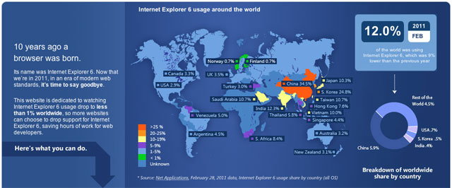 หนึ่งในเว็บเบราว์เซอร์ ที่เราใช้งานกันบ่อยที่สุดอย่าง Internet Explorer (IE) ของ Microsoft ที่เราเห็นเป็นปุ่มสีฟ้าๆ กลมๆ บนหน้า Desktop ที่ปัจจุบันก็มีให้อัพเกรดไปถึงรุ่น 9 แล้ว แต่เชื่อไหมว่าก็ยังมีคนใช้ IE รุ่น 6 อยู่เป็นจำนวนมาก จนทาง Microsoft ผู้ผลิตเบราว์เซอร์ตัวนี้ต้องออกมาทำ Online campaign ให้เราๆ ท่านๆ เลิกใช้ IE6 เลยเปิดเว็บไซต์? The Internet Explorer 6 Countdown แต่ที่ผมว่ามันเก๋ดีคือเปิดให้ผู้ใช้อินเทอร์เน็ตมีส่วนร่วมในการบอกต่อเพื่อนๆ ให้ช่วยกันเลิกใช้ด้วย ไม่ใช่แค่ทำเว็บบอกว่าทำไมควรเลิก