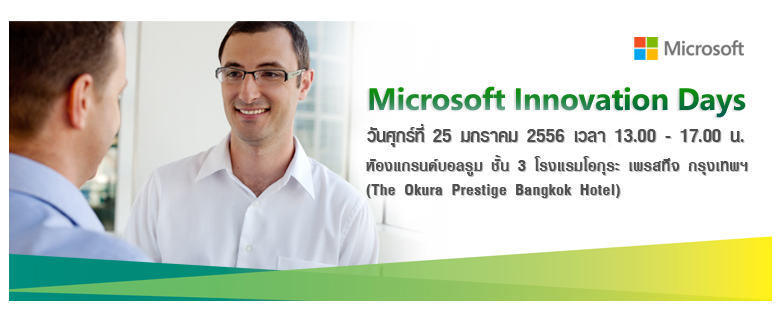 ติดเครื่องให้พร้อมสำหรับการเคลื่อนพลนักพัฒนาซอฟต์แวร์และองค์กรของคุณสู่อนาคต งาน Microsoft Innovation Days จะรวบรวมอัพเดทเทคโนโลยี ใหม่ๆ รวมทั้งทรัพยากรที่สำคัญ และมุมมองทางธุรกิจ