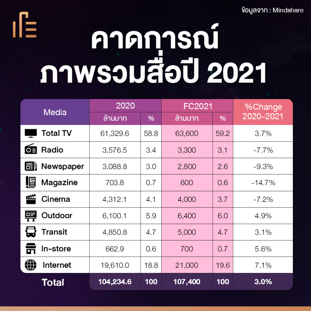 โดยตารางนี้คือตัวเลขคาดการณ์ภาพรวมสื่อโฆษณาของปี 2021 หากมีการเติบโตหรือฟื้นตัวของเศรษฐกิจเพิ่มขึ้น 3% แม้ว่าตัวเลขที่คาดการณ์นี้ยังไม่อาจการันตีได้ว่าจะสะท้อนถึงภาพรวมเศรษฐกิจที่ดีหรือไม่ แต่มายด์แชร์แนะนำว่าอยากให้แบรนด์ยังคงใช้จ่ายอย่างต่อเนื่อง เพราะการรักษาชื่อของแบรนด์ไว้ตลอดจะดีกว่าการเงียบหายและรอเวลาฟื้นทางเศรษฐกิจค่อยมาลงทุน