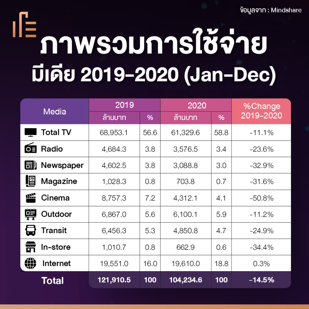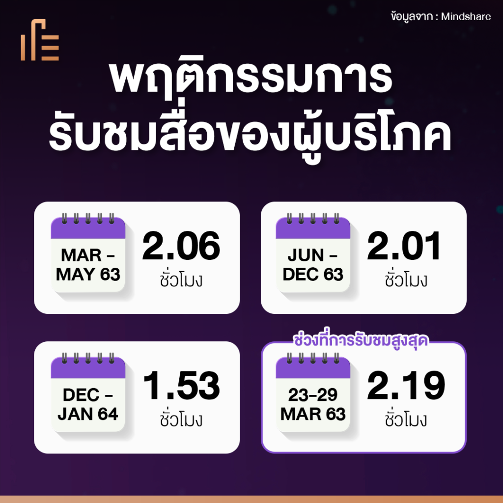 ทางด้านของสถิติการรับชมสื่อทีวีในปีที่ผ่านมา มีตัวเลขที่ฟื้นกลับมาดีขึ้นอาจเพราะคนอยู่บ้านเยอะขึ้น และใช้เวลาในการรับชมนานขึ้น อาจเป็นเพราะการเปิดทิ้งไว้เพื่อเป็นเพื่อนแก้เหงาหรือเพื่อรับฟังข่าวสารที่ผู้บริโภคยังคงมองว่าสื่อทีวีน่าเชื่อถือกว่าสื่อประเภทอื่นๆ