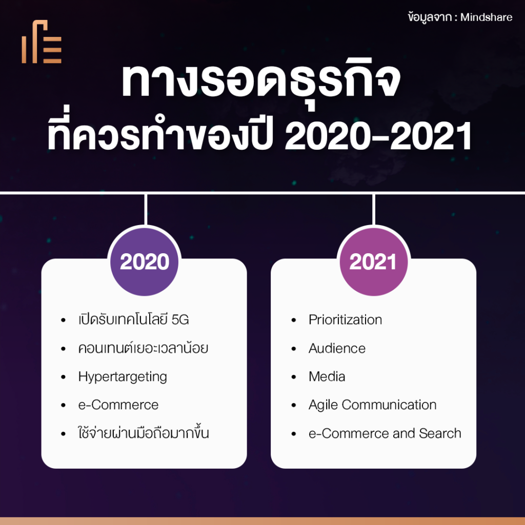 ทางด้านของมายด์แชร์ก็ได้แนะนำแนวทางสำหรับธุรกิจที่กำลังหาทางออกว่าควรจะโฟกัสในเรื่องใดและมองหาโอกาสในการสร้างธุรกิจใหม่ๆ หรือการปรับตัวเพื่อรับโอกาสในอนาคต