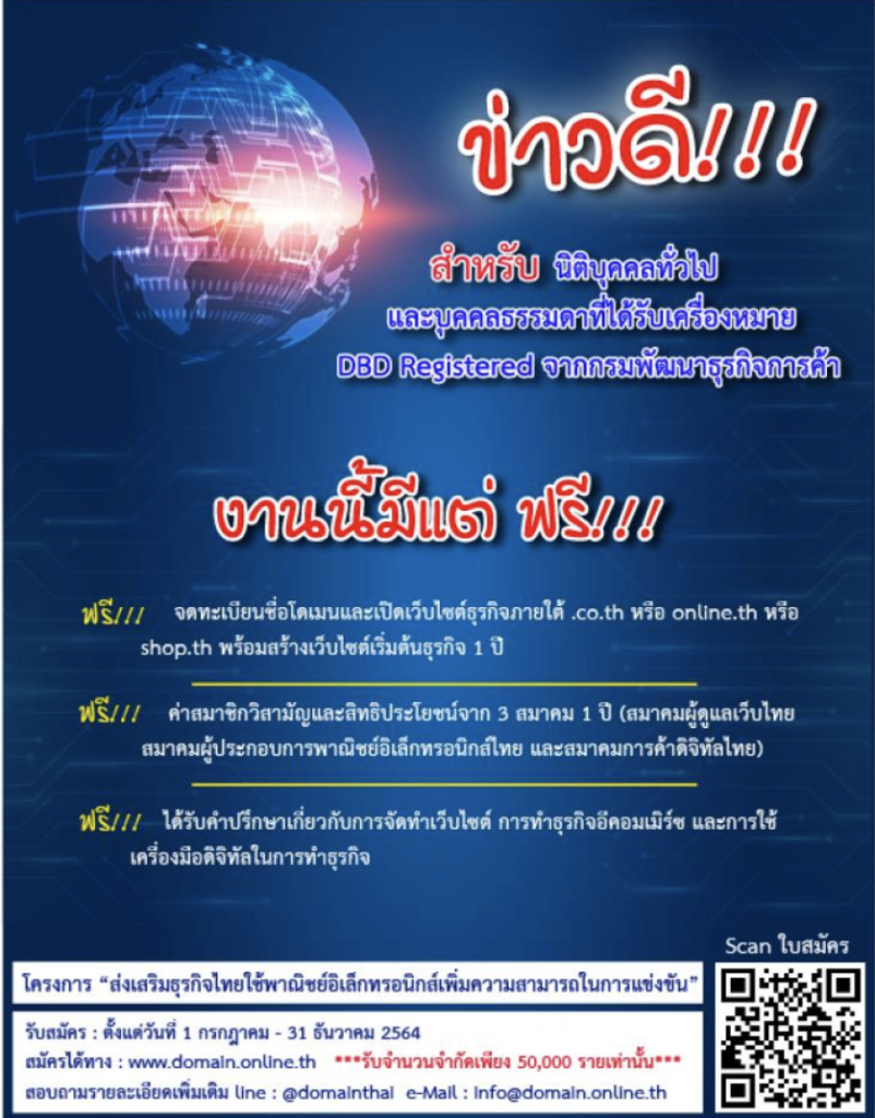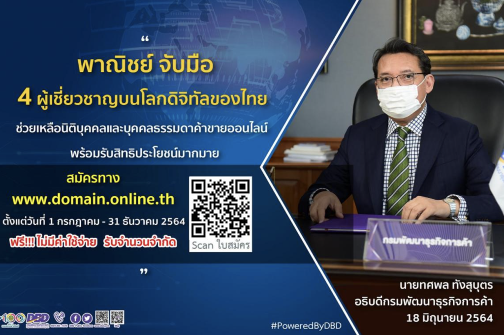 กระทรวงพาณิชย์ โดย กรมพัฒนาธุรกิจการค้า จับมือ 4 องค์กร…ผู้เชี่ยวชาญบนโลกดิจิทัลของประเทศ ช่วยเหลือนิติบุคคลและบุคคลธรรมดาค้าขายออนไลน์ ช่วยแล้ว..ต้องช่วยให้ถึงที่สุด งานนี้…จึงมีแต่ฟรี!!! โดเมน..ฟรี ค่าสมาชิกวิสามัญและสิทธิประโยชน์มากมาย..ฟรี พร้อมให้คำปรึกษาค้าขายออนไลน์..ฟรี รับจำนวนจำกัดเพียง 50,000 ราย สมัครกันยาวๆ ตั้งแต่ 1 กรกฎาคม – 31 ธันวาคม 2564 ทาง www.domain.online.th สมัครเต็ม…ปิดระบบทันที