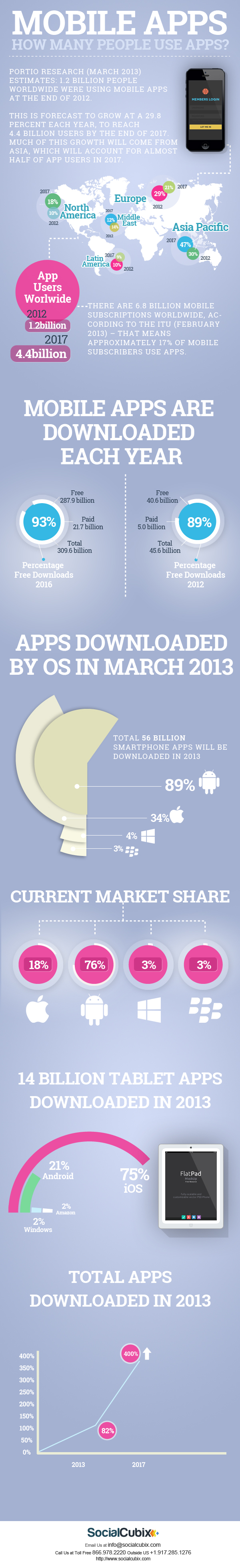 ในปีนี้ (2013) คาดว่าจะมียอดดาวน์โหลดแอพบนมือถืออยู่ที่ 56 พันล้านแอพ ซึ่งระบบปฏิบัติการที่ถูกใช้งานเพื่อดาวน์โหลดแอพมากที่สุด คือ Android โดยคิดเป็นยอดการดาวน์โหลดสูงถึง 89% และยังครองส่วนแบ่งในตลาดสูงสุดอยู่ที่ 76% ตามมาด้วยการดาวน์โหลดผ่านระบบปฏิบัติการ iOS (34%), Windows Phone (4%) และ Blackberry (3%)