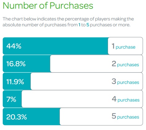 ในกลุ่มคอเกมที่ยอมซื้อ in-game purchases ราว 44% ตัดสินใจซื้อ 1 ครั้ง ขณะที่อีก 20% ตัดสินใจซื้อซ้ำเกิน 5 ครั้งขึ้นไป ด้านล่างคือกราฟแสดงรายละเอียดจำนวนครั้งการซื้อเกม