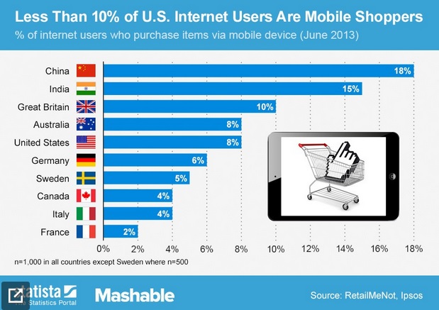 สำนักข่าว Mashable นำแผนภูมิของ Statista มาแจงสถิติล่าสุดในวงการช้อปปิงออนไลน์ผ่านอุปกรณ์มือถือทั่วโลก โดยยกข้อมูลจาก 10 ประเทศชั้นนำในวงการไอทีมาโชว์ว่าตลอดเดือนมิถุนายนที่ผ่านมา 3 ประเทศที่มีสัดส่วนการซื้อสินค้าผ่านอุปกรณ์พกพาทั้งแท็บเล็ตและสมาร์ทโฟนมากที่สุดในโลกคือจีน อินเดีย และอังกฤษ