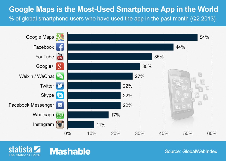 บริษัทสำรวจ GlobalWebindex ได้จัดอันดับแอพพลิเคชันบนสมาร์ทโฟนที่ถูกใช้งานบ่อยที่สุด ประจำไตรมาสที่ 2 ของปี 2013 นี้ โดยทำการสำรวจจากประชากรที่ใช้สมาร์ทโฟนกว่า 960 ล้านคน