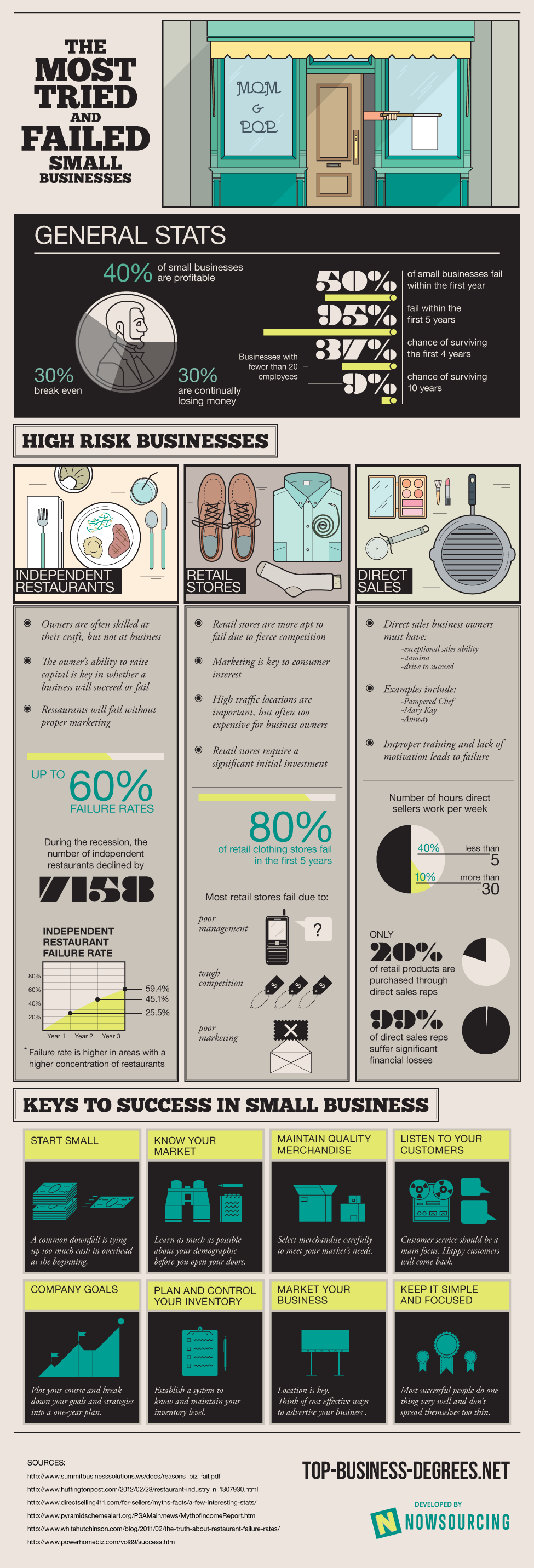 เว็บไซต์ Top-Business-Degrees.net รายงานว่า ในปัจจุบันผู้ที่ทำธุรกิจขนาดย่อมสามารถแบ่งออกได้เป็น 3 กลุ่ม คือ กลุ่มที่สามารถทำกำไร (40% ของ SME ทั้งหมด) กลุ่มที่มีผลประกอบการระดับปานกลาง (30%) และกลุ่มที่มีผลกระกอบการขาดทุน (30%) หากลองเจาะลึกลงไปจะพบว่า มีธุรกิจขนาดย่อมที่ปิดตัวลงหลังจากเปิดกิจการภายใน 5 ปีแรกถึง 95% และยังมีอีกกว่า 50% ที่ปิดกิจการภายในระยะเวลาเพียงแค่ 1 ปี
