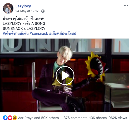 อย่างล่าสุดที่ Lazyloxy เป็นพรีเซ็นเตอร์ให้กับเมล็ดทานตะวัน Sunsnack จนมียอดแชร์เพลงหลักล้าน ยอดแชร์เพลงหลักหมื่นแชร์ในไม่กี่วัน หรือจะเป็นเพลงยอดฮิตติดหูของน้ำยาปรับผ้านุ่ม Comfort ที่ดึง Wonderframe และแกงส้ม มาร้องเพลงคู่กันเพลง ชู้แต่เธอไม่รอบ ชอบแต่เธอไม่รู้ แถมยัง Tie In สินค้าได้อย่างแนบเนียนและไม่ขัดหูขัดตาอีก จนยอดวิวทะลุ 19 ล้านวิวในไม่กี่เดือน