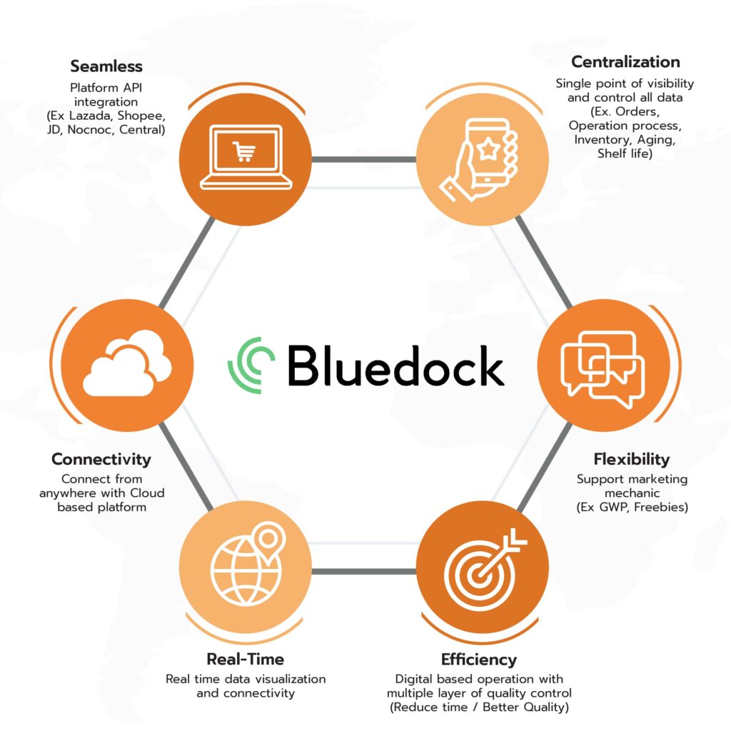 เพราะระบบคลังสินค้าอีคอมเมิร์ซจำเป็นต้องใช้ความแม่นยำระดับสูงในการบริหารสินค้าแต่ละชิ้นBluedock จึงช่วยเพิ่มประสิทธิภาพตั้งแต่กระบวนการรับสินค้าเข้าคลัง (Inbound Process) การค้นหาตำแหน่งจัดเก็บที่เหมาะสม (Storage) พร้อมทั้งจ่ายสินค้าออกจากคลังด้วยวิธีที่มีประสิทธิภาพ (Picker)โดยระบบจะคัดเลือกสินค้าที่ควรออกจากคลังก่อน อย่างสินค้าที่เข้ามาในคลังเป็นอันดับต้นๆ หรือสินค้าที่อยู่ในโซนที่มีของน้อยกว่าและอยู่ด้านบน เพื่อให้มีพื้นที่สำหรับของที่จะเข้ามาในคลังต่อไป รวมถึงบริหารจัดการพื้นที่จัดเก็บอย่างมีประสิทธิภาพมากขึ้น นอกจากนี้ ยังช่วยอำนวยความสะดวกในกระบวนการแพ็คสินค้า (Packing) ไปจนถึงติดตามสินค้าและขนส่ง (Order Status)