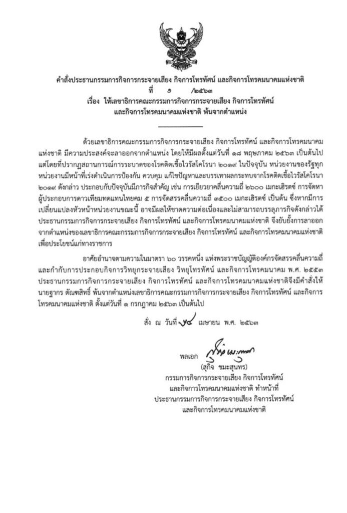 เพื่อประโยชน์แก่ทางราชการ อาศัยอํานาจตามความในมาตรา 60 วรรคหนึ่ง แห่งพระราชบัญญัติองค์กรจัดสรรคลื่นความถี่และกํากับการประกอบกิจการวิทยุกระจายเสียง วิทยุโทรทัศน์ และกิจการโทรคมนาคม พ.ศ.2553 ประธานกรรมการกิจการกระจายเสียง กิจการโทรทัศน์ และกิจการโทรคมนาคมแห่งชาติ จึงมีคําสั่งให้ นายฐากร ตัณฑสิทธิ์ พ้นจากตําแหน่งเลขาธิการคณะกรรมการกิจการกระจายเสียง กิจการโทรทัศน์ และกิจการโทรคมนาคมแห่งชาติ ตั้งแต่วันที่ 1 กรกฎาคม 2563 เป็นต้นไป