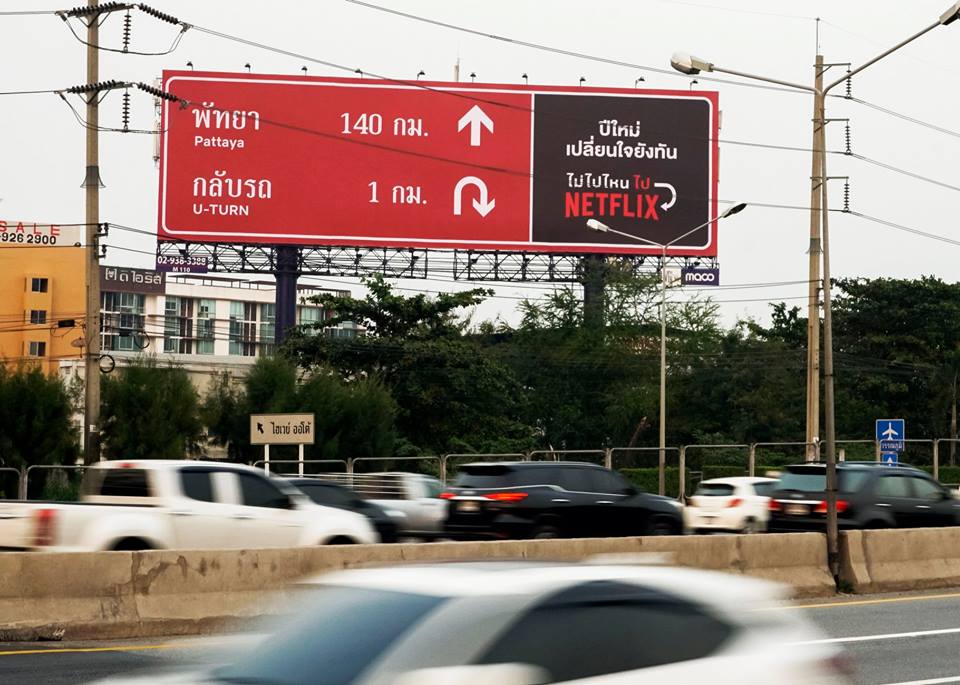 บิลบอร์ดที่ Netflix สร้างสรรค์มามีจุดต่างจากบิลบอร์ดค่ายอื่น หนึ่งในนั้นคือตำแหน่งการติดที่ยึดช่วงแยกกลับรถบนถนนที่มุ่งหน้าไปยังสถานที่ท่องเที่ยวสุดฮิตช่วงเทศกาล จุดต่างสำคัญยังอยู่ที่เนื้อหา ที่ระบุว่าใครที่หวั่นใจกับรถติด ก็สามารถเปลี่ยนใจกลับรถข้างหน้า และท่องเที่ยวไปกับหนังและซีรี่ส์ใน Netflix แทน