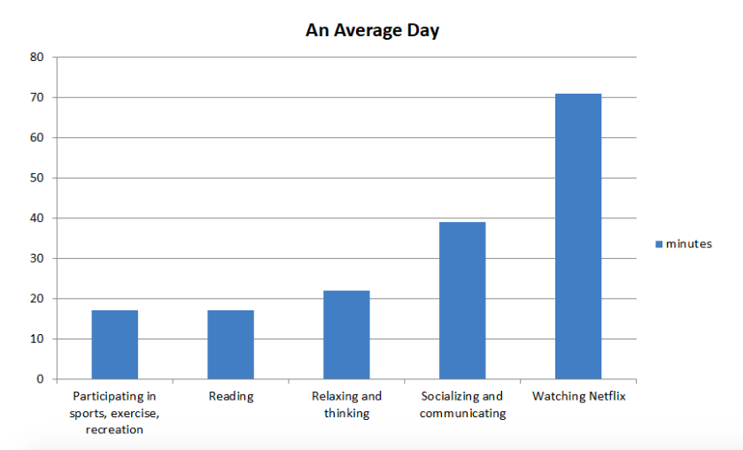จุดที่น่าสนใจคือ Cordcutting.com ย้ำว่า Netflix มีพลังมากกว่า ”การอ่าน”, “การพักผ่อนและการคิด” รวมถึง “การเล่นกีฬา ออกกำลังกาย และการพักผ่อนหย่อนใจ” จุดนี้ข้อมูลระบุว่าโดยเฉลี่ยแล้วชาวอเมริกันใช้เวลาออกกำลังกายเพียง 17 นาทีต่อวันเท่านั้น เชื่อว่าสมาชิก Netflix ในไทยก็จะมีสัดส่วนเฉลี่ยน้อยนิดไม่ต่างกัน