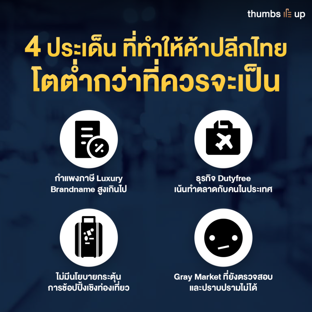 - กำแพงภาษี Luxury Brandname สูงเกินไป – เดิมสร้างกำแพงภาษีสูงถึง 30-40 เปอร์เซ็นต์เพราะกลัวฟุ่มเฟือย แต่เพื่อนบ้านภาษีของสินค้าแบบนี้คิดเพียง 4-5 เปอร์เซ็นต์เท่านั้น ไทยจึงควรเปลี่ยนนโยบายตรงนี้ เพราะ Luxury Brandname มันเปลี่ยนเป็น Lifestyle brandname แล้ว