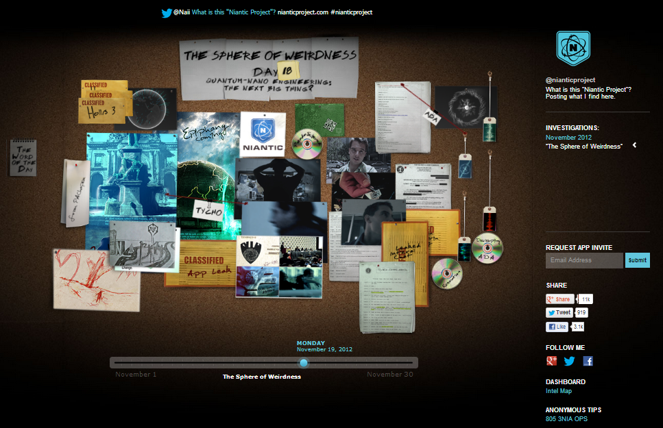 คลิปไวรัลนี้ดูเหมือนจะเป็นส่วนหนึ่งของแคมเปญยาวหนึ่งเดือนที่ค่อยๆ เปิดเผยปมต่างๆ ออกมาทีละนิดก่อนที่จะสิ้นสุดในวันที่ 30 พฤศจิกายนนี้ ซึ่งเมื่อเข้าไปที่ตัวเว็บหลักที่?Niantic Project แล้วจะพบว่ามีเบาะแสรูปแบบต่างๆ ทั้งภาพถ่าย คลิป รหัส ฯลฯ อยู่เต็มไปหมด ซึ่งเราอาจจะเดาได้ว่ามีส่วนประกอบของ Augmented Reality, QR code และลูกเล่นอื่นๆ อยู่ด้วย นอกจากนั้นเบาะแสที่ผ่านมายังแสดงให้เห็นถึงโทรศัพท์ชนิดหนึ่งที่ไม่ต้องใช้ SIM card อีกด้วย