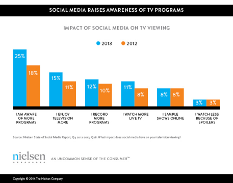 ข้อมูลแรกคือการสำรวจของ Nielsen พบว่าผู้ชมทีวี 25% รับรู้ความเคลื่อนไหวของผังรายการทีวีมากขึ้นจากโซเชียลมีเดีย โดย 15% ของผู้ชมระบุว่าได้รับความสนุกสนานมากขึ้นเมื่อชมรายการไปพร้อมกับรับข้อมูลทางโซเชียลมีเดีย