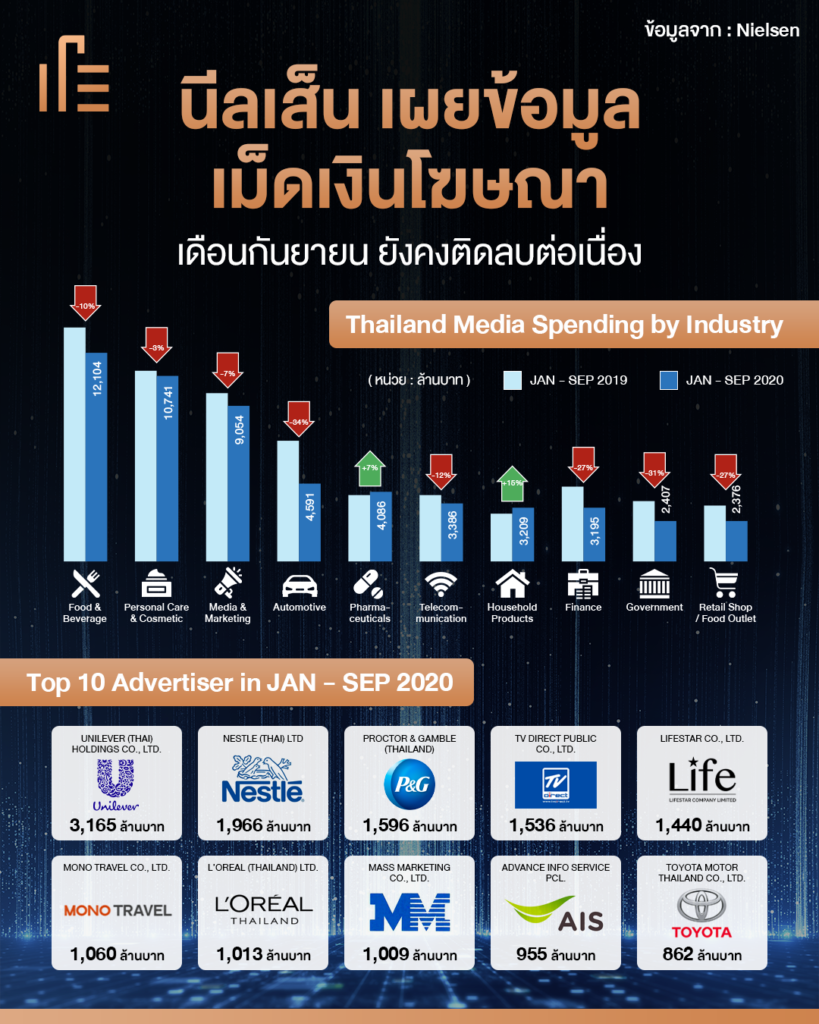 ในส่วนของบริษัทที่ใช้เม็ดเงินโฆษณาสูงสุดของเดือนมกราคมถึงกันยายนปี 2020 โดย 3 ลำดับแรกได้แก่