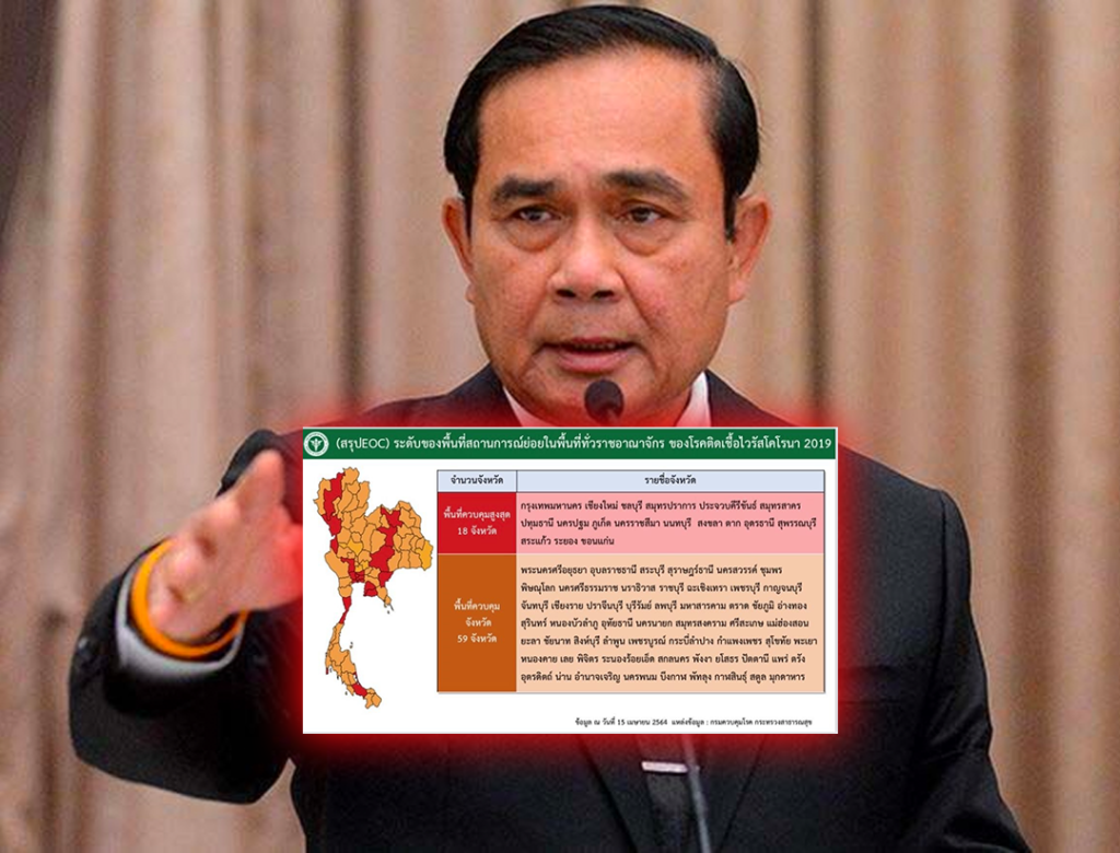 - ระดับที่ 1 พื้นที่ควบคุมสูงสุด (สีแดง) จำนวน 18 จังหวัด ได้แก่ กรุงเทพมหานคร เชียงใหม่ ชลบุรี สมุทรปราการ ประจวบคีรีขันธ์ สมุทรสาคร ปทุมธานี นครปฐม ภูเก็ต นครราชสีมา นนทบุรี สงขลา ตาก อุดรธานี สุพรรณบุรี สระแก้ว ระยอง และขอนแก่น