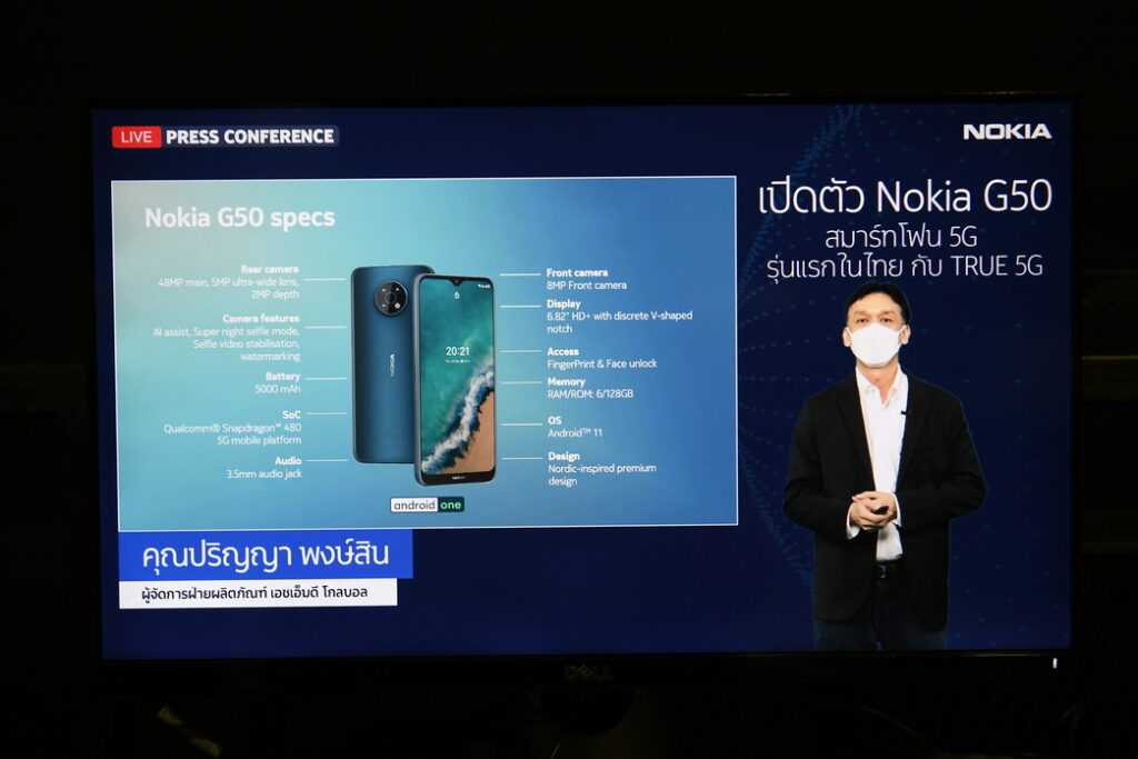 นายปริญญา พงษ์สิน ผู้จัดการฝ่ายผลิตภัณฑ์ บริษัท เอชเอ็มดี โกลบอล จำกัด (HMD) กล่าวว่า Nokia G50 เป็นสมาร์ทโฟนในกลุ่ม G-series ใหม่ล่าสุด ด้วยจอแสดงผลระดับ HD +ขนาด 6.82 นิ้ว คมชัดทั้งภาพนิ่งและวิดีโอ กล้อง AI ที่มาพร้อมกับกล้อง 3 เลนส์ ความละเอียด 48MP เก็บทุกภาพพร้อมร่วมแชร์ด้วยความเร็วสูงบนเครือข่าย 5G โดยมีชิปเซ็ตSnapdragon 480 5G จาก Qualcomm ที่ออกแบบมาเพื่อเพิ่มประสิทธิภาพเทคโนโลยี รองรับ 5G ในปัจจุบันและอนาคต
