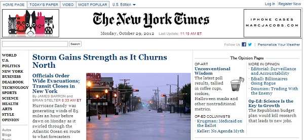 การยกเลิก Paywall ชั่วคราวของ New York Times เกิดขึ้นบนเว็บไซต์ข่าว nytimes.com และแอพพลิเคชัน New York Times ตั้งแต่บ่ายวันอาทิตย์ที่ 28 ตุลาคมที่ผ่านมาตามเวลาสหรัฐฯ เหตุผลคือเพราะประชาชนจำนวนมากพร้อมใจเปิดเว็บไซต์ข่าวออนไลน์เพื่อหาข้อมูลเพิ่มเติมเกี่ยวกับเฮอร์ริเคน Sandy ซึ่งเป็นพายุที่กำลังจะขึ้นฝั่งเข้าสู่เมือง New Jersey ในช่วงคืนวันจันทร์นี้ ซึ่งอาจนำไปสู่ภัยบ้านเรือนเสียหายและสาธารณูปโภคถูกตัดขาด