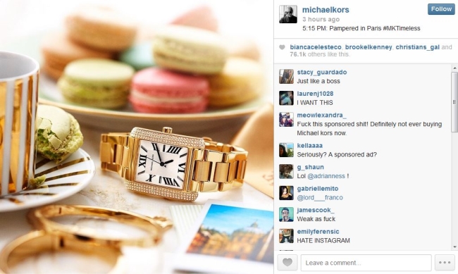 แม้ว่าเราจะมองไม่เห็นว่าภาพนี้เป็น Sponsor จริงหรือเปล่า แต่ถ้าลองเข้าไปดูตัว instagram ของทาง Michael Kors โดยตรงก็จะเห็นว่าจำนวน like ของภาพนี้สูงกว่าภาพที่โพสขึ้นปกติ ซึ่งอยู่ประมาณ 40,000 – 60,000 likes แต่ภาพนี้มีถึง 229,000 Like รวมทั้งหากได้อ่านความเห็นแล้ว นั่นก็น่าจะบอกได้ (เกือบ 100%) ว่าภาพนี้เป็นภาพโฆษณาที่ปรากฎบน instagram จริง ซึ่งความเห็นนั้นออกมาไม่ค่อยจะดีเสียเท่าไหร่เรื่องการเริ่มทำภาพโฆษณาบนนี้
