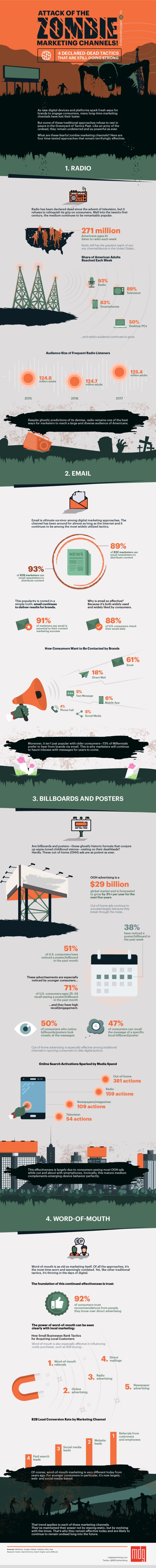 เช่นตัวอย่างหนึ่งใน Infographic นี้ของบริษัท MDG Advertising ที่แสดงให้เห็นว่าบางช่องทางสื่อเก่ามีชีวิตชีวาดีอยู่ คือสื่อวิทยุ ที่ชาวอเมริกันกว่า 271 ล้านคนยังฟังอยู่ในทุกสัปดาห์