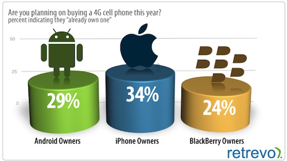 รองลงมาก็จะเป็นสมาร์ทโฟนอย่าง Android OS และ BlackBerry ที่ตัวเลขร้อยละ 29 และ 24 ตามลำดับ โดยที่เป็นเช่นนี้คาดว่าผู้ใช้งาน iPhone 4 น่าจะเข้าใจผิดว่า เลข “4” ?ที่อยู่ในชื่อ iPhone 4 นั้นมาจากคำว่า “4G” เช่นเดียวกับ iPhone 3G ที่เคยออกมาก่อนหน้านี้ (อันนี้เหมือนบ้านเราตรงที่ บางคนยังคงเรียก iPhone 4 ว่า “iPhone 4G” อยู่เลย ^^)