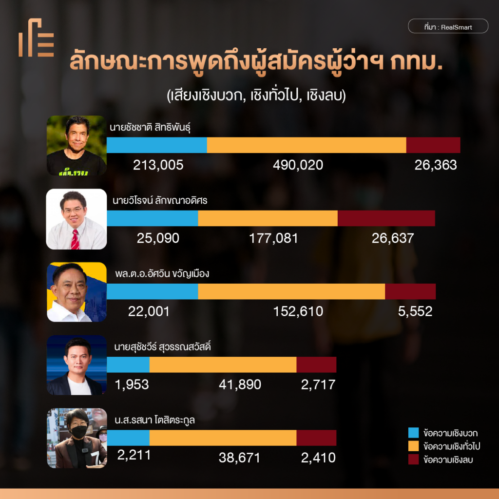 ลักษณะการพูดถึงผู้สมัครผู้ว่าฯ กทม. (เสียงเชิงบวก, เชิงทั่วไป, เชิงลบ)