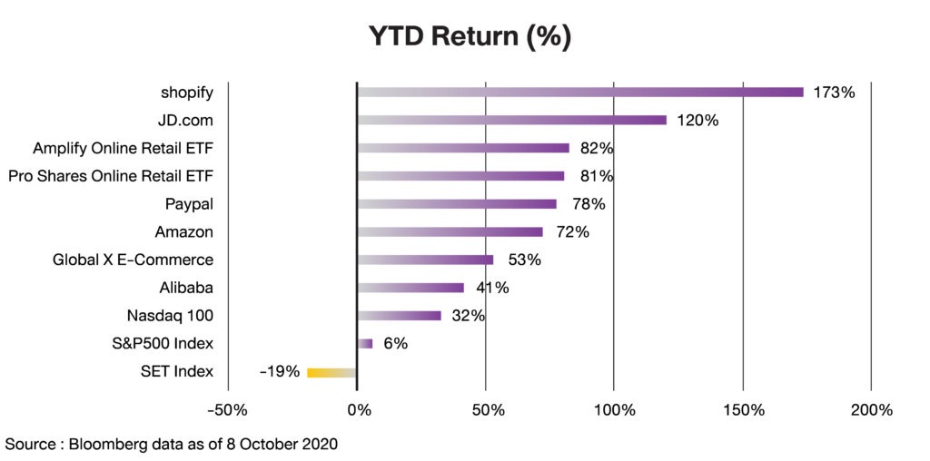โดยตั้งแต่ต้นปี 2020 ที่ผ่านมาแม้ว่าดัชนี Nasdaq จะเป็นที่พูดถึงในเรื่องของผลตอบแทนที่สูงถึง 32% แต่เมื่อเทียบกับ ETF Online Retail อย่าง Amplify Online Retail ETF (+82%) , Pro Shares Online Retail (+81%) หรือ Global X E-Commerce (+53%) หรือแม้กระทั่งหุ้นรายตัวที่กล่าวถึงและอยู่ใน ETF ข้างต้นอย่าง Shopify(+173%), Amazon (+72%) , Paypal (+78%) , Alibaba (+41%) , และ JD.com (+120%) ทั้งนี้หากนำไปเปรียบเทียบกับดัชนีหุ้นทั่วไปอย่าง S&P500 ที่+6% หรือ SET ที่ยังติดลบ -19% นั้นจะเห็นได้ว่าผลตอบแทนค่อนข้างแตกต่างกันอย่างมาก