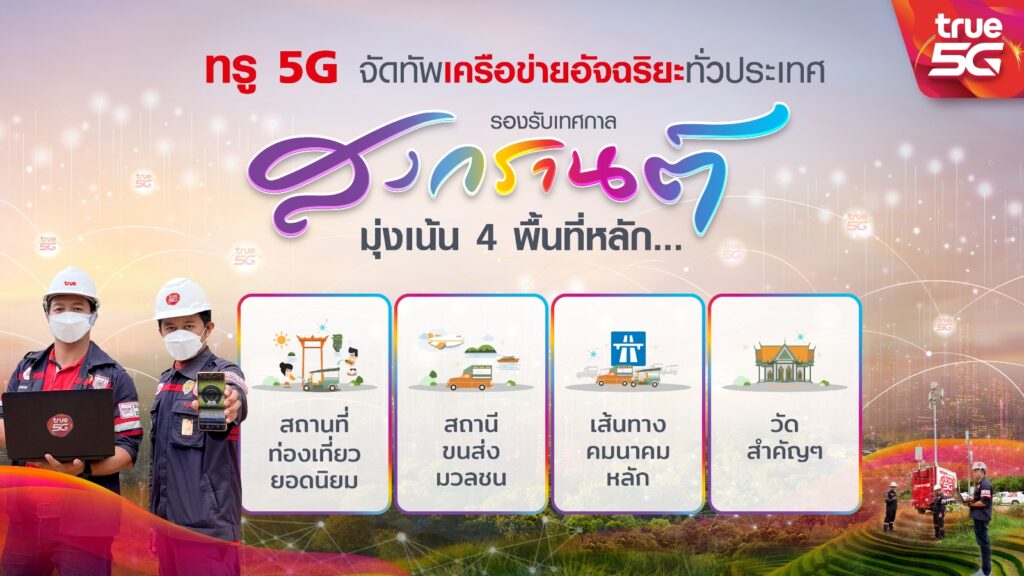 ทรู 5G เตรียมความพร้อมทุกสถานการณ์ ทุกช่วงเวลาแห่งความสุขเพื่อคนไทย โดยเฉพาะในช่วงเทศกาลสงกรานต์ที่ยังคงต้องปฏิบัติตามมาตรการป้องกันโรคโควิด-19 อย่างเคร่งครัด ทรูได้จัดทัพทีมวิศวกรเตรียมพร้อมโครงข่ายรองรับการใช้งานมือถือเพิ่มในช่วงเทศกาลสงกรานต์ โดยมุ่งเน้น 4 พื้นที่หลัก สถานที่ท่องเที่ยวยอดนิยม สถานีขนส่งมวลชนและสนามบิน เส้นทางคมนาคมสายหลักที่เชื่อมต่อภูมิภาค และวัดสำคัญๆ ตลอดจนพื้นที่สักการะสิ่งศักดิ์สิทธิ์ เพื่อความเป็นสิริมงคล โดยขยายสัญญาณ 4G/5G/WiFi รวมทั้งติดตั้งรถโมบายล์ชุมสายเคลื่อนที่เร็ว (COW) กว่า 100 คัน รวมทั้งจัดทีมดูแลคุณภาพสัญญาณตลอด 24 ชั่วโมง ตั้งแต่วันที่ 8 – 18 เมษายน 2565