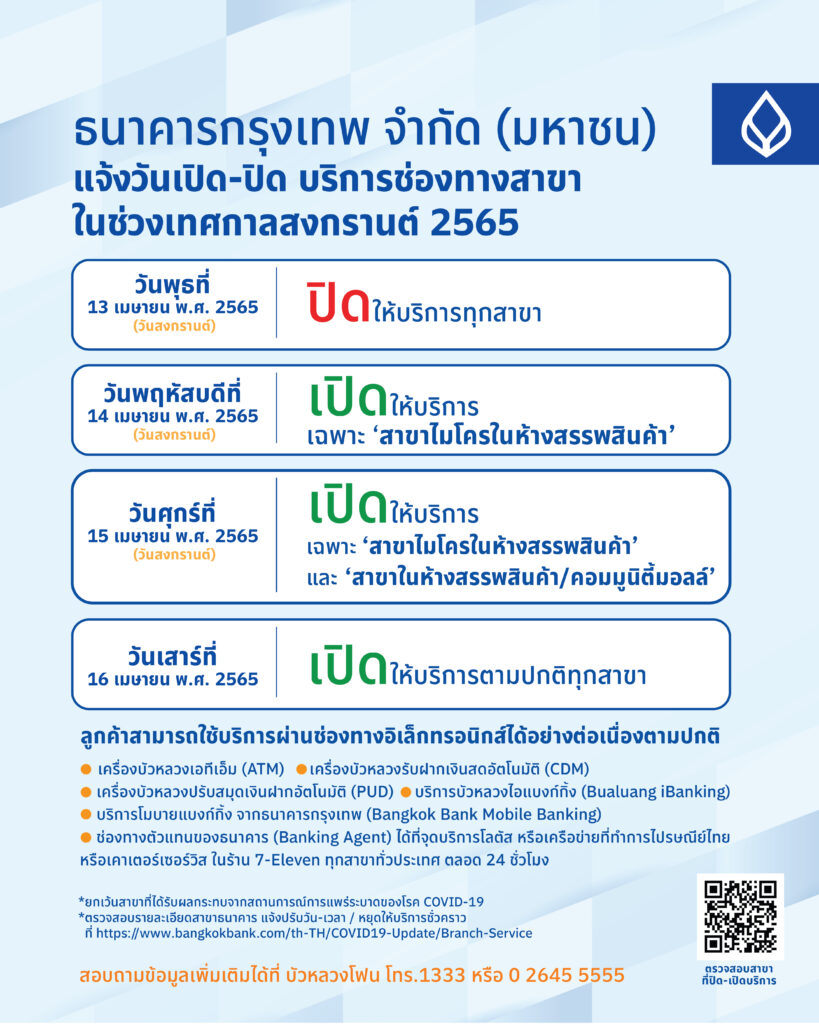 สำหรับช่วงวันหยุด ลูกค้าสามารถใช้บริการทางการเงินของธนาคารกรุงเทพได้ที่ ‘สาขาไมโครในห้างสรรพสินค้า’ กว่า 200 แห่งทั่วประเทศ ยกเว้นในวันพุธที่ 13 เมษายน พ.ศ.2565 ที่จะปิดให้บริการเพียง 1 วัน และยกเว้นสาขาที่ได้รับผลกระทบจากสถานการณ์แพร่ระบาดของโรค COVID-19 รวมถึงยังสามารถใช้บริการผ่านช่องทางตัวแทนของธนาคาร (Banking Agent) ได้ที่จุดบริการโลตัส หรือเครือข่ายที่ทำการไปรษณีย์ไทย หรือเคาเตอร์เซอร์วิส ในร้าน 7-Eleven ทุกสาขาทั่วประเทศ ตลอด 24 ชั่วโมง รวมกว่า 15,000 จุด ซึ่งยังเปิดให้บริการเป็นปกติ ภายใต้มาตรฐานด้านสุขอนามัยเพื่อร่วมป้องกันและควบคุมการแพร่ระบาดโรค COVID-19 ของกระทรวงสาธารณสุขอย่างเคร่งครัด