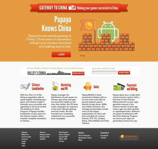 โดยธุรกิจหลักของ Papaya คือการสร้าง Mobile Social Network สำหรับเกมบน Android โดยโฟกัสทั้งเกมแนว Casual และ Virtual Currency ทำฟีเจอร์ด้าน Social ให้กับเกมต่างๆ เพื่อเพิ่มความสนุกสนานร่วมกับเพื่อนๆ ?.. แต่สำหรับสิ่งที่จะมาแนะนำวันนี้ไม่ใช่บริการดังกล่าว แต่คือบริการใหม่ของพวกเค้าที่ชื่อว่า “Gateway to China” (ชื่อบ่งบอกมาก ^^) นั่นก็คือการนำเสนอโปรแกรมสำหรับนักพัฒนา Android ทั่วโลกที่หวังเจาะตลาดในจีนซึ่งเป็นบ่อขุมทรัพย์รายใหญ่เพราะมีจำนวนประชากรมากที่สุดในโลก Papaya เน้นว่าในเมืองจีนนั้นมีผู้ใช้โทรศัพท์มือถือกว่า 800 ล้านคนและกว่าครึ่ง (ของผู้ใช้สมาร์ทโฟน) ในจีนนั้นใช้ระบบปฏิบัติการณ์ Android โดย Solution ที่ทาง Papaya นำเสนอให้กับนักพัฒนาต่างประเทศได้แก่