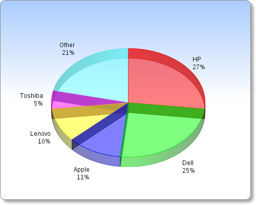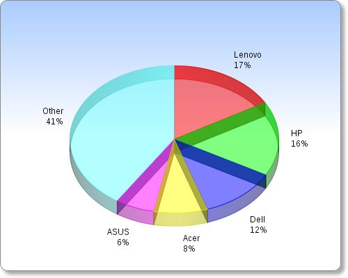 ยอดขาย PC โดยรวมทั่วโลก ในปัจจุบันมี Lenovo ที่ครองส่วนแบ่งมากที่สุดที่ 17% และ HP มีส่วนแบ่งที่ 16% ถัดมาเป็น Dell ที่มีส่วนแบ่งอยู่ที่ 12%