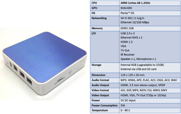 Penta™ เป็นอุปกรณ์ที่สามารถใช้เป็น Platform เพื่อนำมาพัฒนาเป็น Medial Player ได้ PentaTM ใช้ซีพียูในตระกูล ARM เช่นเดียวกับอุปกรณ์มือถือและแท็บเล็ตทั่วไป จึงทำให้ตัวอุปกรณ์มีการใช้พลังงานที่น้อยลงกว่า Media Player อื่นๆ แต่ยังคงทำงานได้ประสิทธิภาพที่มากเทียบเท่ากับ PC แต่มีราคาอยู่ในระดับเพียงแค่ไม่กี่พันบาท ซึ่งต่ำกว่า Media Player ที่มีอยู่ทั่วไปในท้องตลาดเป็นอย่างมาก และตัวอุปกรณ์ Penta ยังมีความทนทาน มีขนาดที่เล็ก น้ำหนักเบา สามารถพกพาได้สะดวก จึงง่ายต่อการติดตั้ง และสามารถจัดวางในพื้นที่ที่จำกัดได้โดยไม่กีดขวาง นอกจากนี้ ในหลายๆงานได้ รวมถึง PentaTM ยังมีพอร์ตเชื่อมต่อต่างๆมากมาย ทั้ง USB, LAN, WiFi, SD card, AV out, VGA, HDMI, Optical ฯลฯ และยังสามารถอัพเกรดซอร์ฟแวร์ผ่านทาง Over-The-Air Upgrade Service (OTA) ได้อีกด้วย จึงทำให้สามารถรองรับการต่อพ่วงกับอุปกรณ์ต่างๆในอนาคต อาทิ Touch-screen monitor เหล่านี้ได้ เป็นต้น