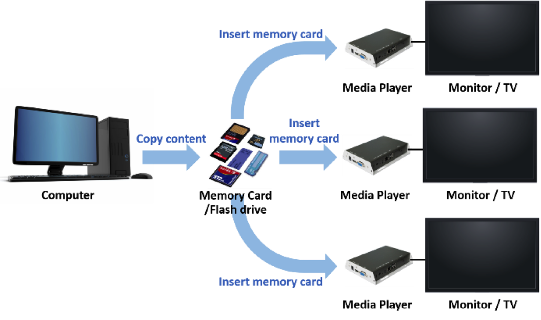รูปแบบ Standalone System เป็นระบบที่ตัว Media player แต่ละตัวทำงานแยกออกจากกัน (Standalone) จึงทำให้ในการควบคุมการทำงานของ Media player ทั้งหมดในระบบนั้น ต้องทำทีละเครื่อง และการอัพเดตข้อมูล Content ต่างๆลง Media player นั้น ต้องอาศัยการ copy ข้อมูลจาก Computer ใส่ Memory card หรือ Flash drive แล้วนำไป update ลงบน Media player อีกที ซึ่งระบบประเภทนี้จะลงทุนน้อยกว่า แต่จะพบกับปัญหาความยุ่งยากในการใช้งาน, ใช้เวลานานในการอัพเดต Content แต่ละครั้ง, และการดูแลและอัพเกรดซอร์ฟแวร์ของอุปกรณ์ทำได้ยากเพราะต้องดูแล Media player กันทีละเครื่อง