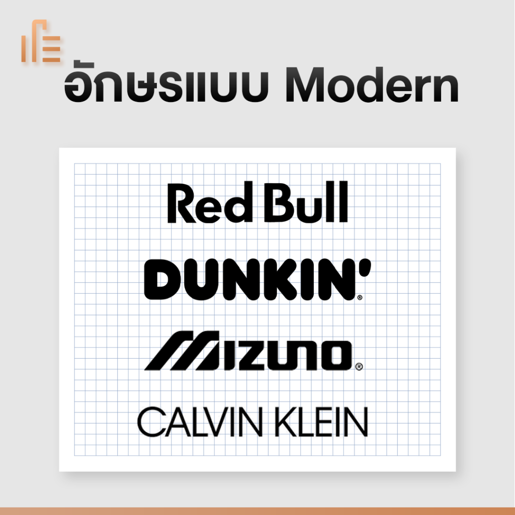 รูปแบบอักษรสมัยใหม่ ออกแบบมาให้ดูเรียบง่าย อ่านง่าย แต่ใส่ลูกเล่นด้วยความหนา-บาง ระยะห่างตัวอักษร สื่อถึงความทันสมัย รวมถึงสามารถออกแบบให้เหมาะสมกับแบรนด์ได้ง่าย ช่วยดึงดูดลูกค้ารุ่นใหม่