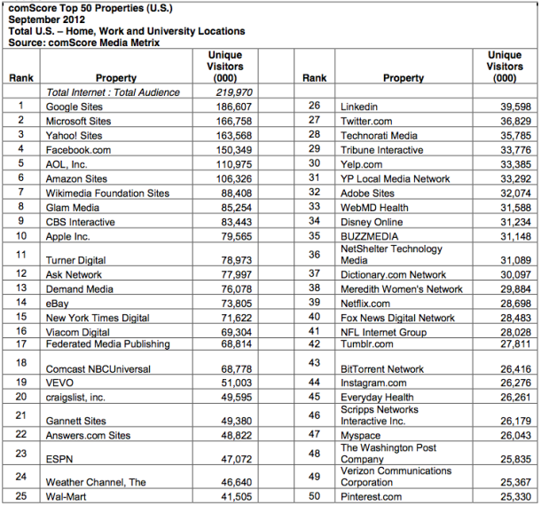ComScore ดำเนินการสำรวจรายชื่อเว็บไซต์ที่ชาวอเมริกันเปิดใช้งานบ่อยที่สุดผ่านบริการ Media Metrix โดยสรุปผลจากการท่องเว็บของผู้ใช้ทุกกลุ่มทั้งในครัวเรือน สำนักงาน และมหาวิทยาลัยในสหรัฐฯตลอดเดือนกันยายน 2012 ที่ผ่านมา โดยผลสำรวจสรุปว่า Google เป็นเว็บไซต์อันดับ 1 ที่ชาวอเมริกันเปิดใช้งานมากที่สุดตามความคาดหมาย ทำสถิติจำนวนผู้ใช้ 187 ล้านคน ตามมาด้วย Microsoft, Yahoo และเครือข่ายสังคมอย่าง Facebook