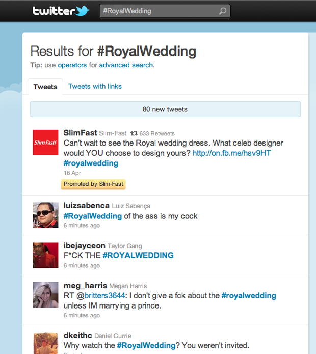 เรื่องของเรื่องคือมีผลิตภัณฑ์ลดความอ้วนชื่อ Slim Fast ไปซื้อโฆษณาแบบ “Promoted trends” (โฆษณาประเภทหนึ่งของ Twitter ที่จับเอาเทรนด์ที่คนกำลังสนใจ) และแน่นอนจะลงทุนทั้งทีก็ต้องเอาให้คุ้ม? Slim Fast เลือกซื้อโฆษณาให้กับแบรนด์ตัวเองบนแท็กอย่าง #RoyalWedding ซึ่งเป็นแท็กที่บอกว่าคนทั่วโลกกำลังสนใจเรื่องพิธีอภิเษกสมรสของราชวงษ์วินด์เซอร์ แต่โชคไม่ดีที่ Promoted Trends เมื่อวานและลิงก์ไปที่ Facebook Page? ของตัวเอง ทำให้ผู้ใช้หลายคนรำคาญมากเสียจนมีพวกมือบอนพิมพ์ว่า ?#RoyalWedding of the ass is my c*ck? ด่าแบรนด์ Slim Fast ที่จ่ายเงินซื้อโฆษณา