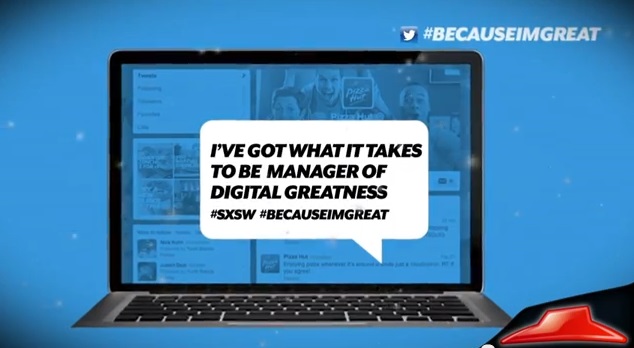 นอกจากนี้ Pizza Hut ยังหวังว่าการจัดพื้นที่สัมภาษณ์งานตำแหน่ง ?Manager of Digital Greatness? ที่สั้นเพียง 140 วินาทีในงาน SXSW จะสามารถเข้าถึงกลุ่มผู้ร่วมงาน ซึ่งถือว่าเป็นผู้ที่สนใจศึกษาเทรนด์ใหม่ในวงการสื่ออย่างจริงจังได้