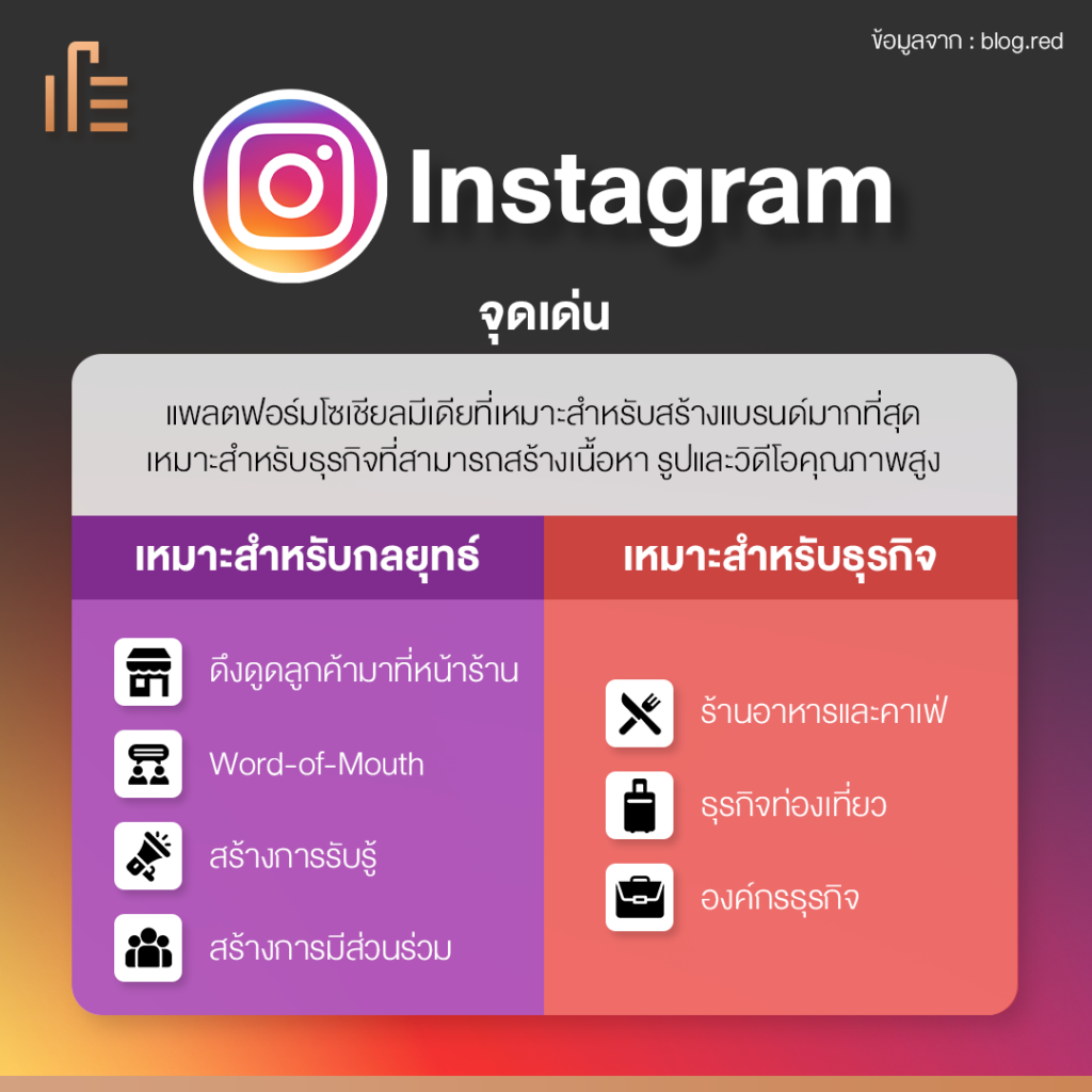 แพลตฟอร์มโซเชียลมีเดียที่เหมาะสำหรับสร้างแบรนด์มากที่สุด เหมาะสำหรับธุรกิจที่สามารถสร้างเนื้อหา รูปและวิดีโอคุณภาพสูง