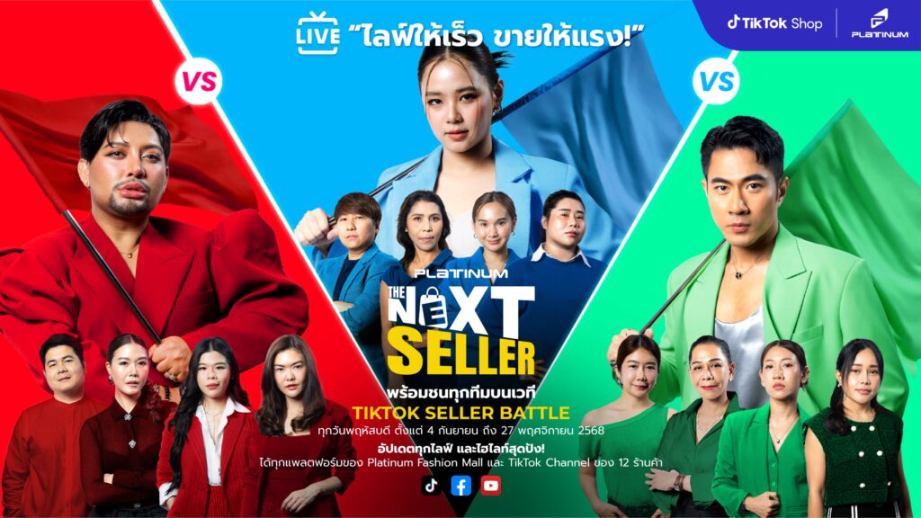 แพลทินัมเข้าใจดีว่าพฤติกรรมผู้บริโภคที่เปลี่ยนแปลงไป ทำให้การขายเพียงอย่างเดียวหน้าร้านอาจไม่เพียงพออีกต่อไป โครงการ “The Next Seller 2025” จึงถูกออกแบบมาในรูปแบบ Reality Game Show เป็นครั้งแรก เพื่อสร้างประสบการณ์จริงให้ร้านค้าที่เข้าร่วมทั้ง 12 ร้าน ได้เรียนรู้และลงมือทำจริงทุกขั้นตอน ตั้งแต่การสร้างคอนเทนต์ไปจนถึงการ LIVE ขายสินค้าบน TikTok Shop