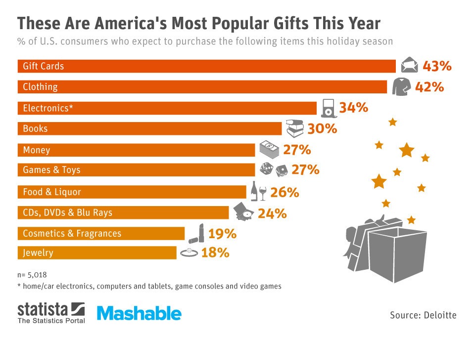 เรารู้กันดีว่าเทศกาลจับจ่ายปลายปีนับเป็นช่วงเวลาสำคัญสำหรับชาวอเมริกันในการหาซื้อสิ่งของต่างๆ เพื่อมอบเป็นของขวัญให้กับคนพิเศษ โดยในปีนี้ (2013) บริษัท Deloitte ได้ทำการสำรวจของขวัญที่ได้รับความนิยมสูงสุดในกลุ่มชาวอเมริกันจนพบว่า“บัตรกำนัล (Gift Card)” จัดเป็นของขวัญที่ผู้คนให้ความสนใจ และอยากมอบให้เป็นของขวัญสูงสุดในช่วงเทศกาลหยุดยาว โดยกว่า 43% ของนักช้อปกลุ่มตัวอย่างวางแผนซื้อบัตรกำนัลอย่างน้อย 1 ชิ้น