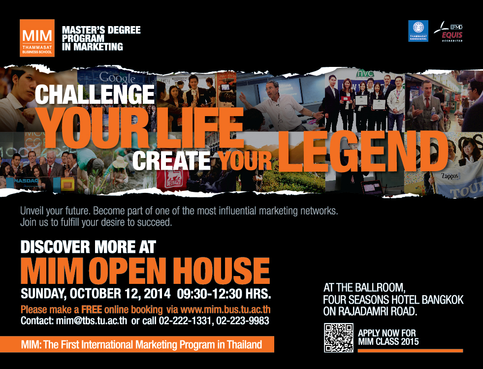 The Master’s Degree Program in Marketing (MIM), Thammasat Business School, Thammasat University will arrange for its Open House (for Entry in March 2015) on Sunday, October 12, 2014: 09:30-12:30 hrs, at the Ballroom of the Four Seasons Hotel Bangkok, Rajadamri Rd. (BTS : Rajadamri Station)