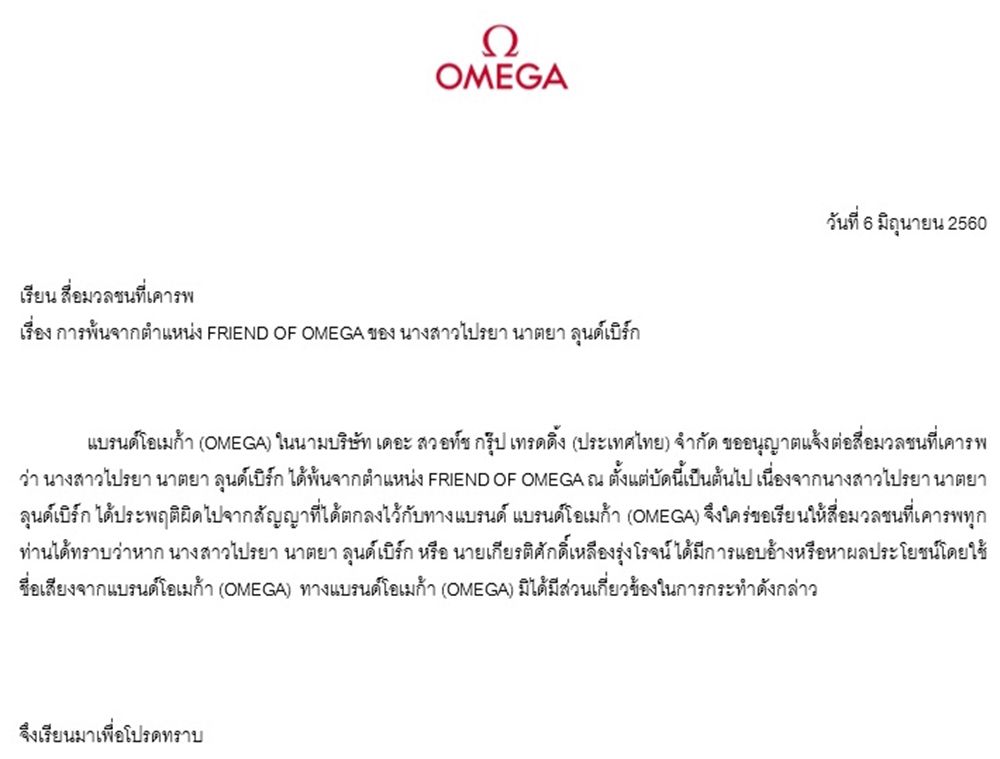 จดหมายจาก OMEGA นั้นลงวันที่ 6 มิถุนายน เนื้อหาใจความระบุสั้นๆ ถึงสาเหตุว่าเพราะสาวปูประพฤติผิดไปจากสัญญาที่ได้ตกลงไว้กับทางแบรนด์ ไม่นาน ฝั่งปู-ไปรยาก็เคลื่อนไหวด้วยการลบภาพตอนไปร่วมงาน OMEGA Speedmaster ฉลองครบรอบ 60 ปีนาฬิกา OMEGA ที่กรุงลอนดอน ประเทศอังกฤษจนหมด