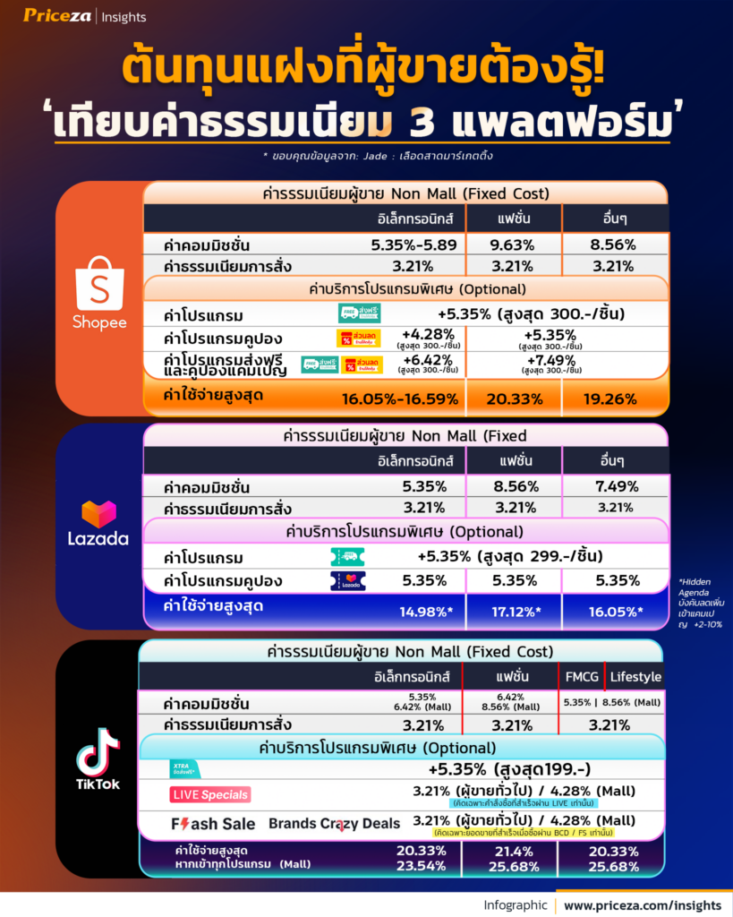 Priceza Insights จึงนำค่าธรรมเนียม 3 แพลตฟอร์ม อย่าง Shopee, Lazada และ TikTok Shop มาเปรียบเทียบให้ร้านค้าและเจ้าของธุรกิจได้รู้กัน