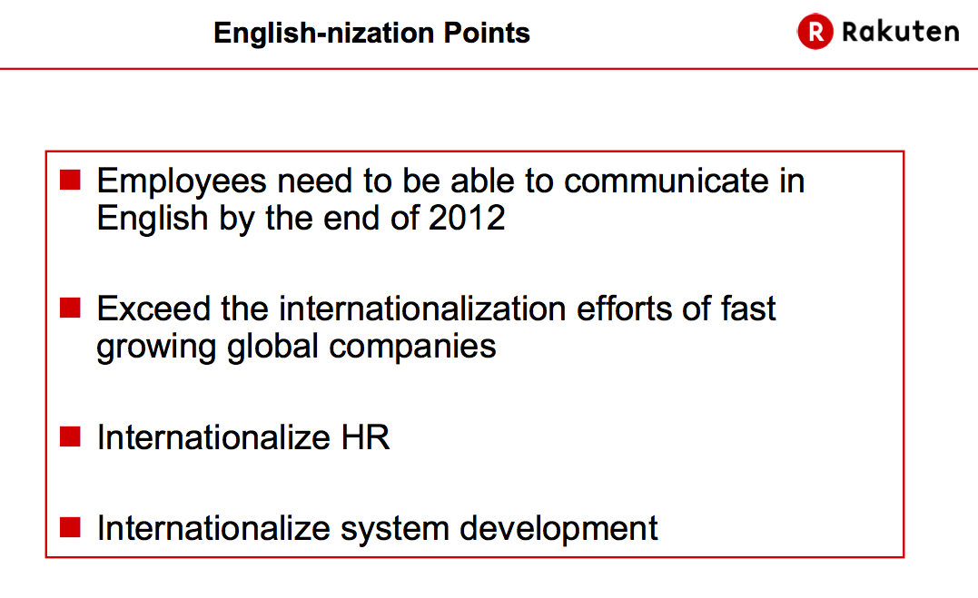 ก่อนหน้าที่จะมีการเข้าซื้อกิจการ TARAD.com “Rakuten” อาจจะเป็นชื่อที่คนไทยไม่ค่อยคุ้นเคยมากนัก แต่วันนี้แตกต่างไป เราเริ่มรู้จัก Rakuten ในฐานะบริษัทญี่ปุ่นที่ไล่บุกควบซื้อกิจการอีคอมเมิร์ซไปทั่วโลก และมีส่ิงหนึ่งที่ Rakuten ได้เริ่มบอกกับผู้บริหารภายใน รวมทั้งนักลงทุนว่า ก้าวต่อไปของบริษัทญี่ปุ่นนี้คือการก้าวเข้าไปสู่การเป็นบริษัทระดับนานาชาติ โดยทาง Rakuten ได้ระบุไว้ในเอกสารภายในที่หลุดออกมาว่า ทางบริษัทเตรียมที่จะปรับโครงสร้างองค์กรทั้งโลกให้มีความเป็นสากลมากขึ้น ด้วยการให้พนักงานพูดคุยภาษาอังกฤษทั้งหมดภายในปี 2555