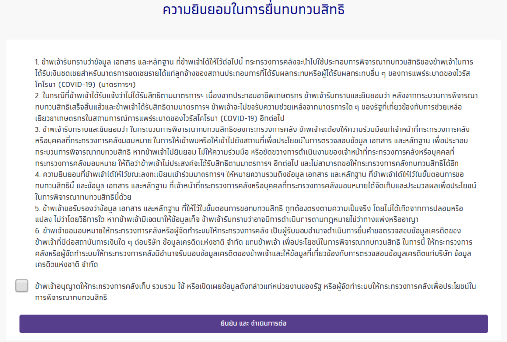 อ่านรายละเอียดและเงื่อนไขต่างๆ ของการยื่นทบทวนสิทธิ แล้วจึงคลิกหน้ากล่องข้อความ “ข้าพเจ้าอนุญาตให้กระทรวงการคลังเก็บ รวบรวมใช้ หรือเปิดเผยข้อมูลดังกล่าวแก่หน่วยงานของรัฐหรือผู้จัดทำระบบให้กระทรวงการคลัง เพื่อประโยชน์ในการพิจารณาทบทวนสิทธิ” จากนั้นคลิก “ยืนยันและดำเนินการต่อ”