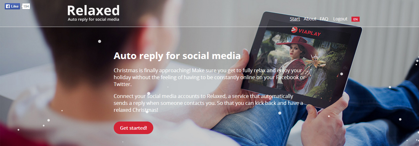 Relaxed คือบริการส่งข้อความอัตโนมัติ เมื่อเพื่อนทวีต หรือ ส่งข้อความหาผู้ใช่ Relaxed เป็นผลงานของ Rodolfo เอเยนซี่โฆษณาแห่งหนึ่งในหระเทศสวีเดน เพื่อเป็นส่วนหนึ่งในเซอร์วิสของ Viaplay ผู้ให้บริการอินเตอร์เน็ต ภาพยนตร์และรายการโทรทัศน์ชั้นนำแห่งหนึ่งในแถบสแกนดิเนเวีย